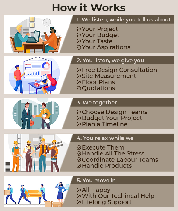 The most important and focused part of our company is to provide services to the distant ones. The ones who are away from their homes and yet want it done in their presence. We take utmost pride in being the leaders in providing such services. We make it like a next door job for our NRI clients, from having deign consultancy to selection of material to execution. All over video calls with a dedicated design personnel from the company.